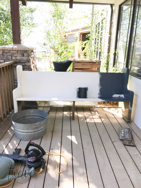 Now that the church pew was painted it was time to accessorize and distress it. Check out this video on how I did it easily: