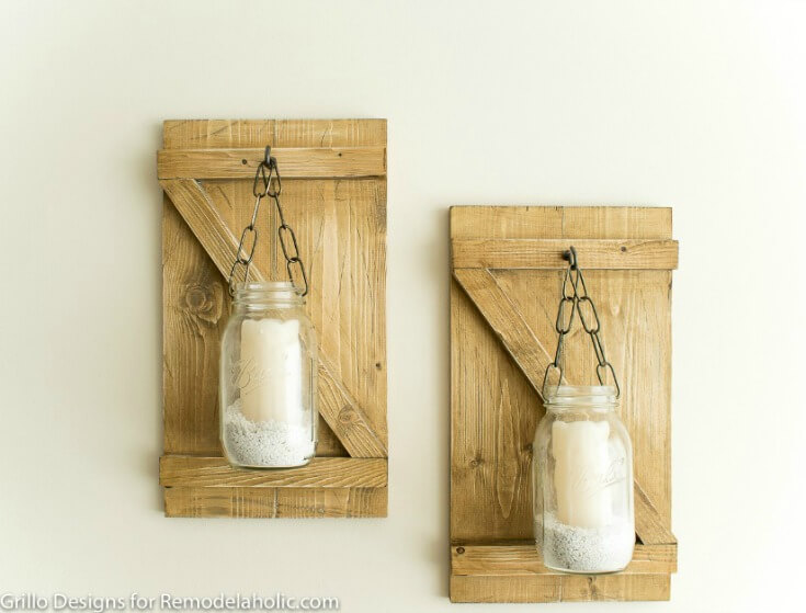 I am obsessed with these hanging mason jar candles by Grillo Designs. The barn door style wood behind the candles is so lovely!