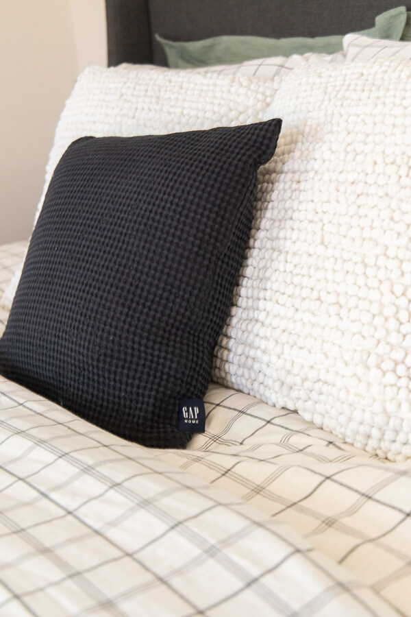Gap Home also has some really nice throw pillows, which I find are always a necessity on any of my beds. I chose two white pillows and a dark charcoal pillow with a similar texture. I love the textures and color shades of these throw pillows. They coordinate with the sheets, comforter and the bed itself.