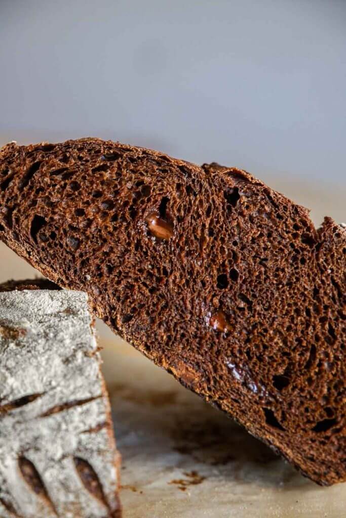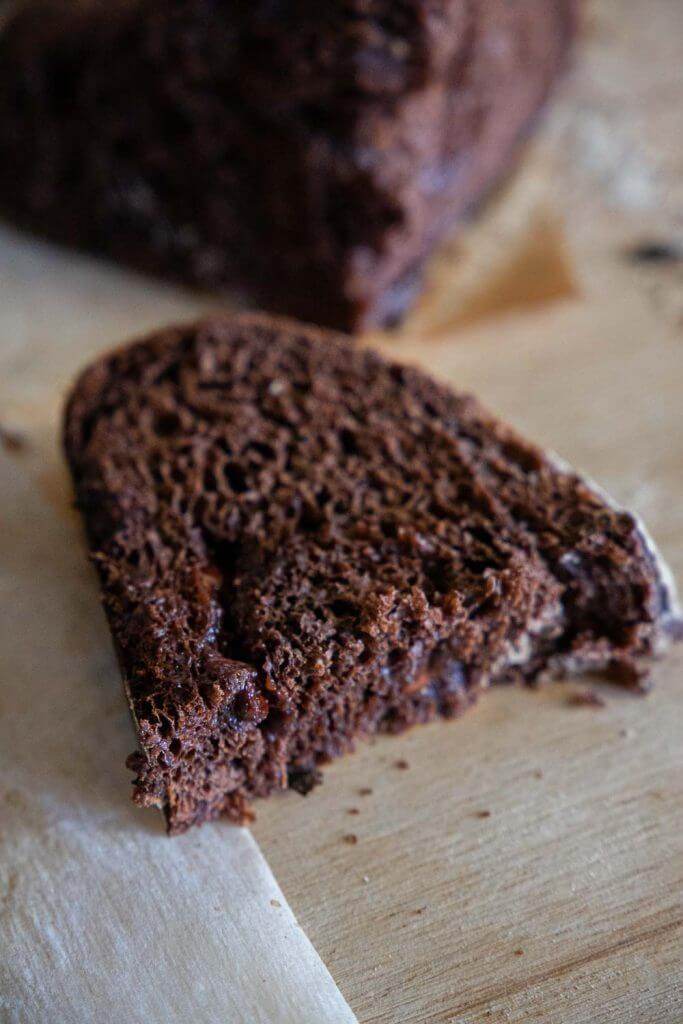 The texture of this chocolate sourdough bread is soft and slightly chewy.