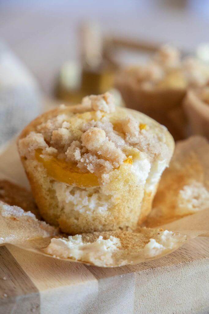 The texture of these peach muffins is so soft and tender and the bits of peaches are a nice sweet and tart surprise for the mouth. The creamy center is the perfect balance.