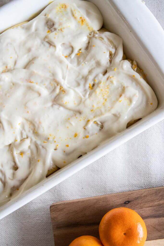 - Apply the frosting while the rolls are still a bit warm but not hot. This allows the thick frosting to melt a bit into the cracks of the orange rolls.