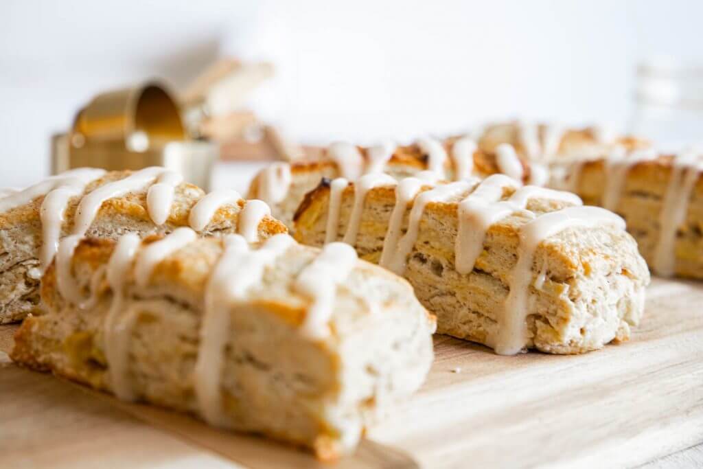 The combination of sweetness and tart of the apple and cinnamon combined with the buttery flaky and tender scone dough creates the perfect treat!