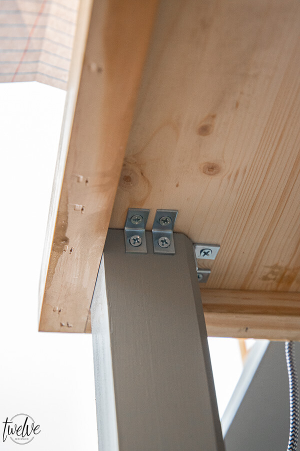 Once we had bracing underneath we then put a level on the tabletop and checked all the sides for level. We then lined the legs up under the table, against corners of the bullnose edging of the table. The bullnose created the perfect spot for the legs to be installed. We used tiny L brackets to install it to the bullnose and the tabletop. It worked perfectly.