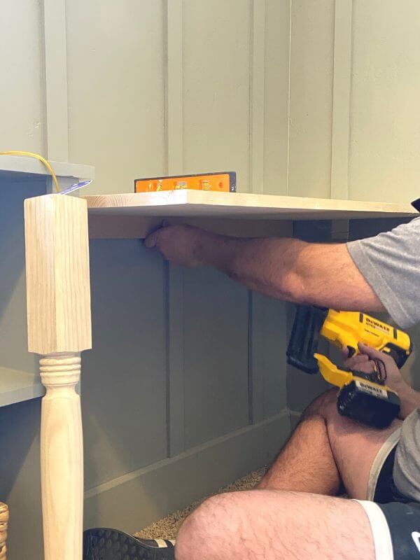 Once the ledger board was up, we then started to add the tabletops and the legs. We used a level to make sure the top was straight and level on all sides. With two people, we were able to hold the one side of the L shaped table up against the wall, where it rested on top of a ledger board. We then added a table leg under the table to give it some strength while we checked for level.