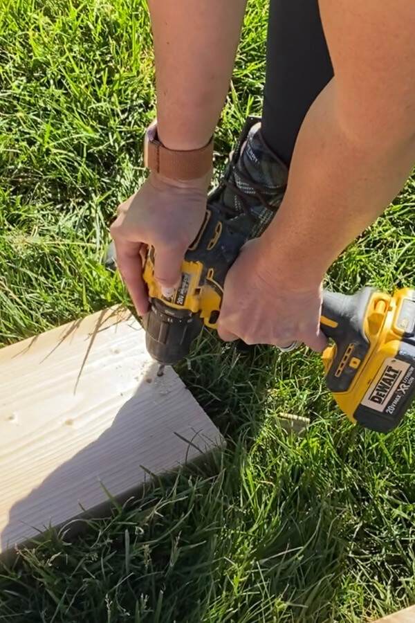 You will cut 2 pieces at 43 1/2 inches. Next you will pre-drill three small holes in the 8 ft pieces. Drill these at the end of the boards. You can see in the image below.