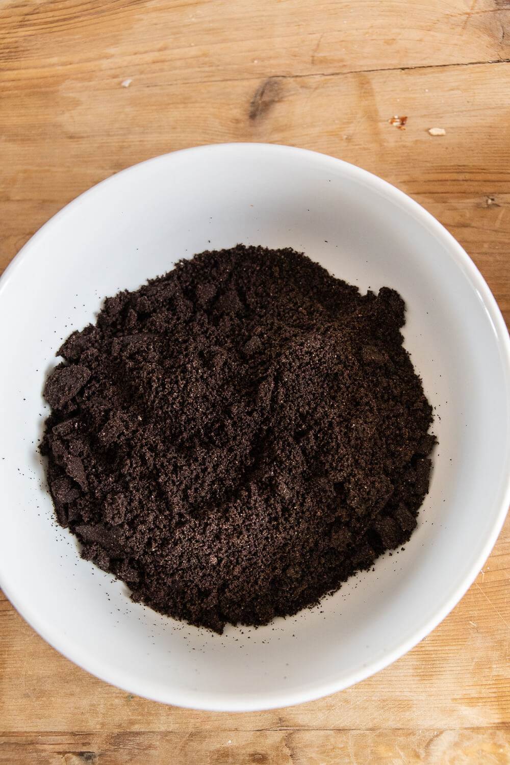 First, crush Oreos into a fine powder. You can use a food processor, a blender, or place them in a bag and use a rolling pin to crush them.