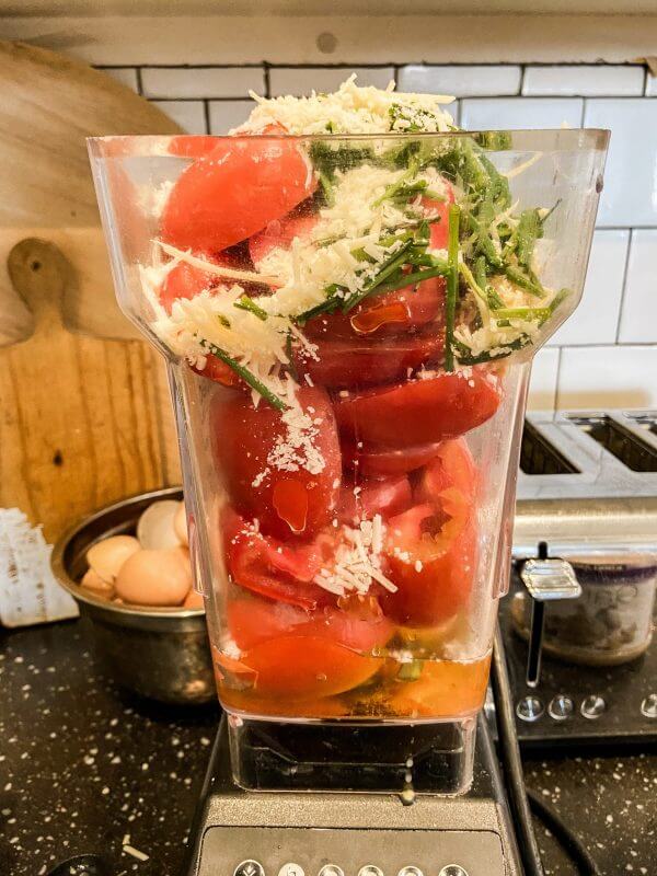 Put your tomatoes, chives, garlic, olive oil, parmesan cheese, salt and basil in the blender. Pulse until it is the desired consistency for you. My kids do not like big tomato chunks so I end up pulsing until it has a finer texture. The smell of this is reminiscent of Bruschetta, and its amazing.