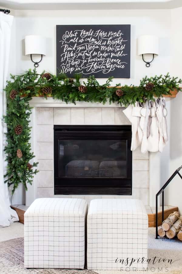 This simple Scandi inspired Christmas fireplace decor takes advantage of nature inspired decor. With a fresh cut Christmas tree, hand wrapped gifts, and fresh cedar garland this mantel is so cozy.