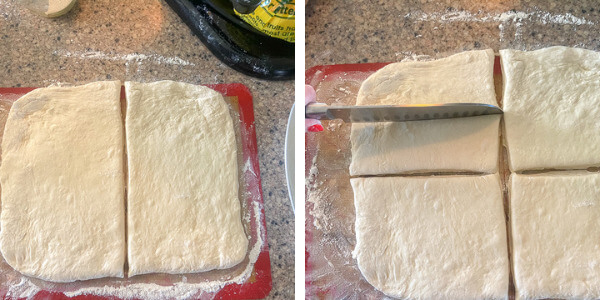 - Cut the rectangle in half the short way. Then cut it in half the long way. Next, but each piece into three pieces. You should have 24 breadsticks.