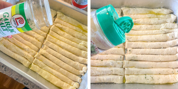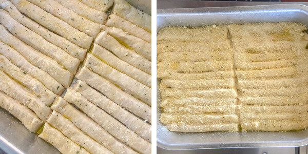 Using a large knife or pizza cutter, cut the dough into 4 sections, then cut those into thirds. This will give you 12 breadsticks on either side, making it 24 equal pieces total. Now, carefully transfer each doughy breadstick into the pan starting on one side and placing them right next to each other, do not leave any space. They will rise and bake together and you will be able to out of the pan like pull apart bread.