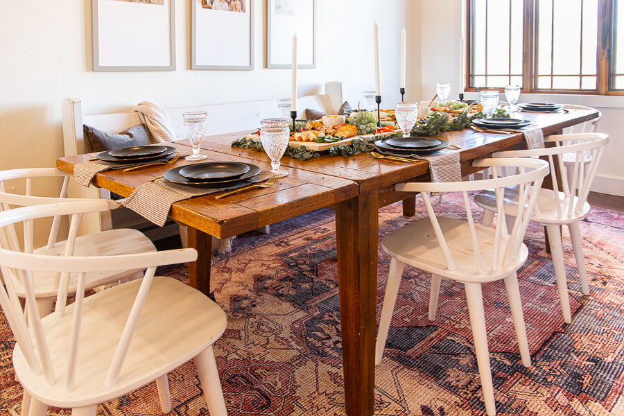 I wanted the board to sit center in the table and be accessible to those sitting on both sides of the table as well as those on the end. That has always been that hardest thing about charcuterie boards. When you have a bunch of people eating from it, it is usually hard for everyone to be able to get access to all the yummy things on it. So, in the spirit of entertaining, I wanted to create a dinner where no matter where you were sitting you could easily access the all the same yummy foods that someone on the opposite side of the table can.