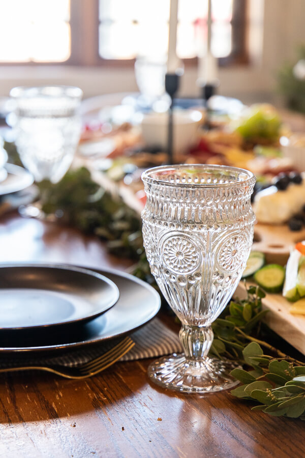 I used some simple greenery from my yard and nestled it under the large board. This table will serve double duty to both the meal and the centerpiece. I have the most amazing cloth napkins. dinnerware and the most gorgeous goblets from Walmart. They look so amazing for this intimate dinner party.