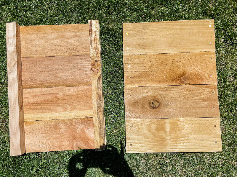 The next step is to lay 4 more of the cedar fence pieces and line them up, and pre-drill and screw them in.