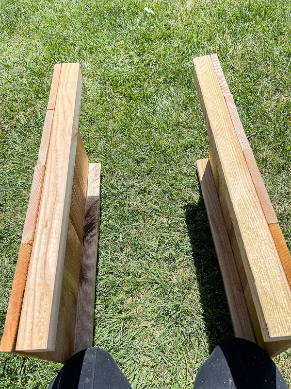 First, lay out two of your 2″ by 2″ boards cut to 21 1/2 inches. Make sure ot lay them on a plat surface. These are the corners of your cedar planter box.
