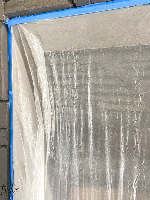 The first thing I did was make sure to tape off everything I did not want painted. I used plastic sheeting to tape off the fireplace and the windows surrounding the fireplace and mantel.