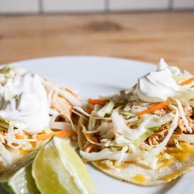 This chicken taco recipe is a wonderful combination of smokey shredded chicken topped with some zesty slaw and a dollop of sour cream.