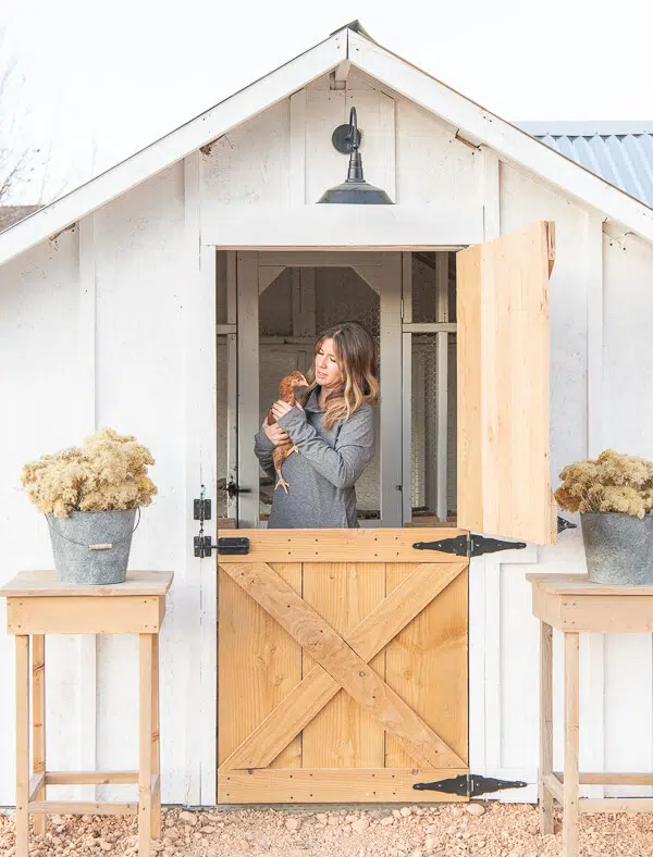 Well, my friends, the weather is getting colder, and we are wrapping up all our summer and fall projects. This year we have been so busy building and adding to our property. We have spent our efforts outside, creating new exciting spaces on our land. We have built a goat house, which now houses 2 goats, created a gorgeous tree house for the kids, and our last project of the summer was our farmhouse chicken coop with a functional yet pretty chicken coop design. Its the best hen house on the block, if I do say so myself.