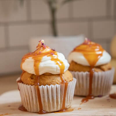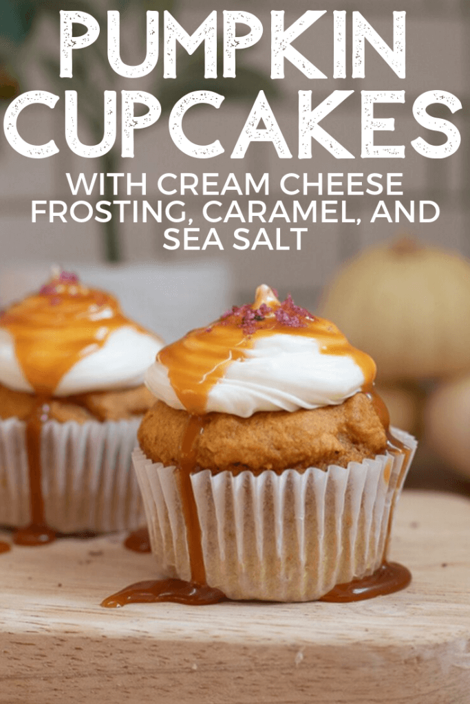 - When the pumpkin cupcakes are completely cooled, pipe them with a generous amount of cream cheese frosting, drizzle with some caramel sauce, and add a pinch of sea salt to the top.