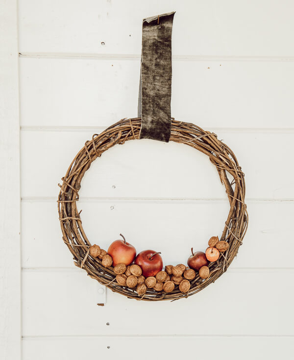 Second I started adding walnuts by hot gluing them to the wreath as well. I nestled them in and around the apples, filling the center of the wreath with an abundance of walnuts. Once I had filled in the areas a the front of the wreaths, I was done! I cut some ribbon to use as a hanger and wrapped it around the wreath. A simple nail through holds it all in place.