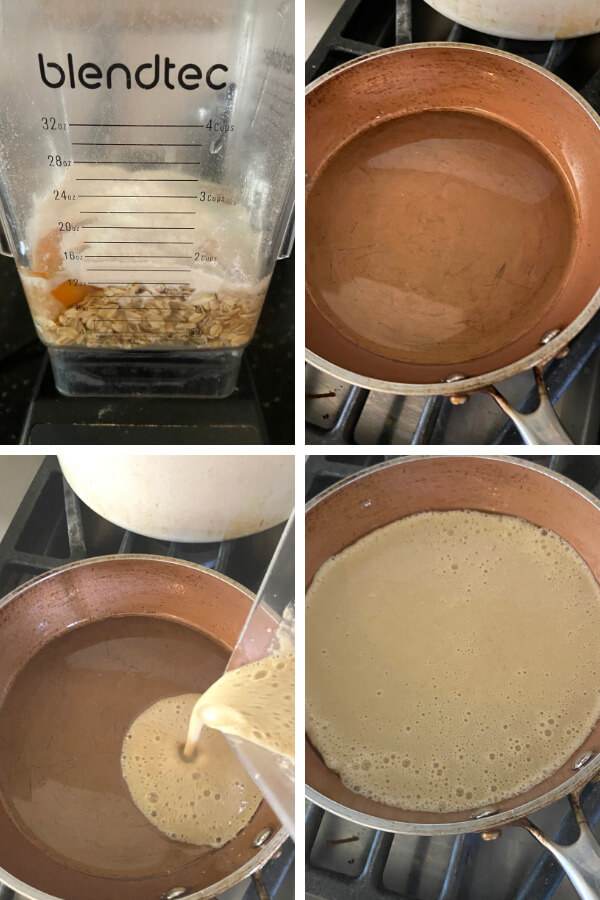 First, put all your ingredients in the blender. This includes old fashioned oats, egg whites, a whole egg, collagen powder or protein powder, baking powder, pure maple syrup, dash of salt, and some vanilla extract. Blend this all up in the blender for 60 seconds. Thats it! This batter is more runny than other pancake batters, but it makes amazing fluffy pancakes. There is no added sugar, other than the pure maple syrup (which you can omit if you use a vanilla protein powder)