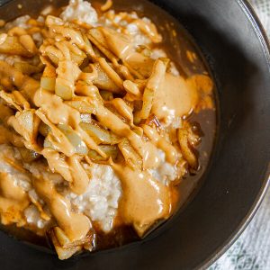 First add your oatmeal to the bowl, then add the spiced apples with some of the maple syrup sauce. Next I drizzle on some of the peanut butter, I like a bit more than my kids. And last, you can choose to eat it as is, but I like to add some of my homemade oat milk to the bowl. You could top this with some crunchy pecans to add more texture as well!