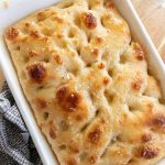 While the dough is rising in the pan, mix your melted butter and honey together. Once it has doubled in size, carefully pour about 2/3 of the honey butter mixture over the top of the dough and gently spread it across with your hands. Now its time to poke those holes in the focaccia bread. Gently poke to create dimples in the bread. The honey butter will fill those dimples.