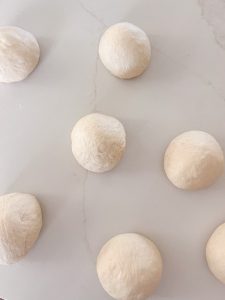 One it is weighed out, you can shape them into balls. Take a piece of dough and mold it into a rough circle. Place it on the counter and use your hand to shape it by moving it in a circle using one hand, creating surface tension on the dough. Place them on a large baking sheet covered in parchment paper. Cover in plastic wrap and let them rise until doubled in size. This may take a few hours. You can place them in the oven uner a proofing setting if you prefer to speed up the process. When they are close to being proofed, preheat the oven to 350 degrees.