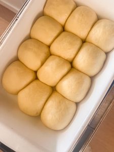 Once the dough has risen to at least 50 percent its time to shape it and put it in your loaf pan. This could take from 6-8 hours.I actually prefer to mix this dough at night and let it sit on my counter overnight. It will be doubled by morning. In the morning, the dough will be ready to be shaped into buns. I use 50 grams of dough for rolls. You can separate and weigh out your dough.
