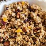 In a large mixing bowl add all your dry ingredients, including rolled oats, dried fruit, and nuts.