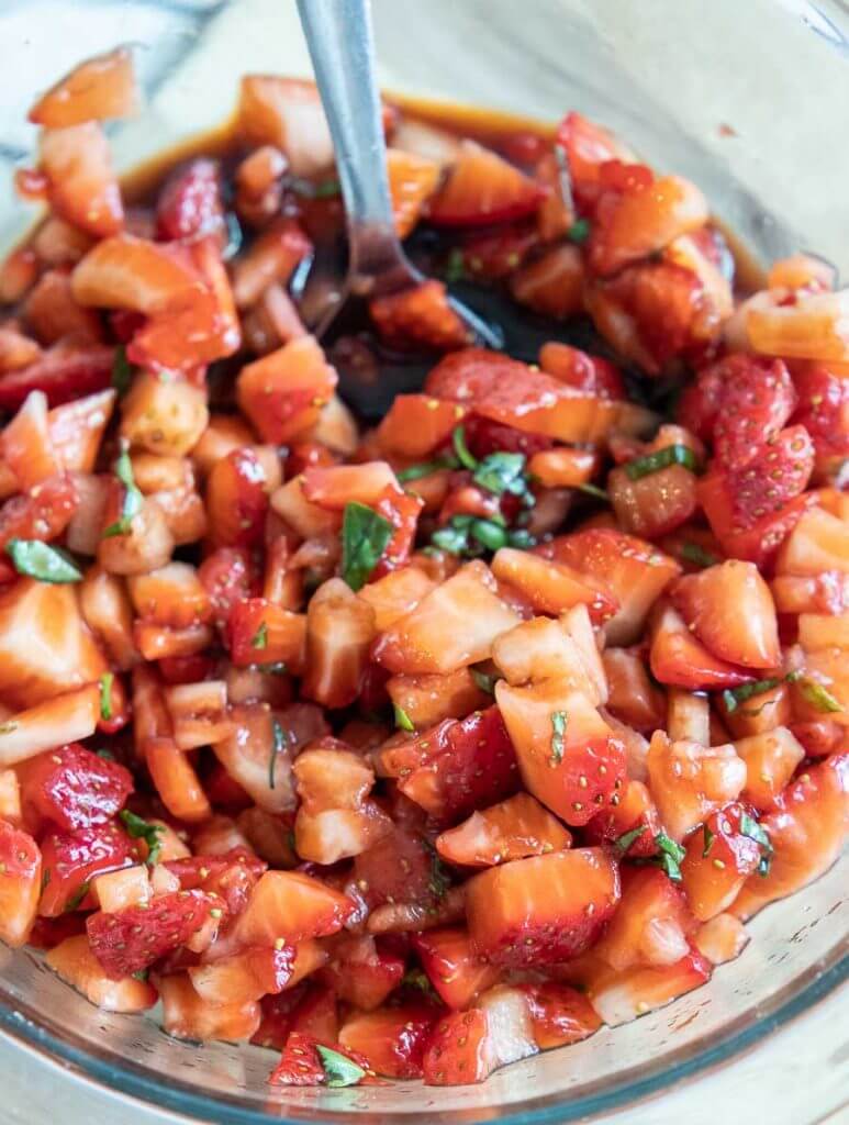 Once you have all this in the bowl, stir this all together and it is ready to serve. I find that this is not something that gets better over time. It is best served fresh and eaten at one sitting. This is the reason why I only make one clamshell of strawberries at a time.