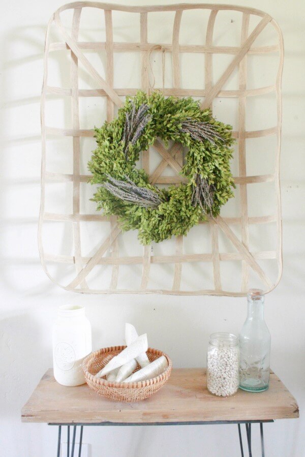 As we wander past the entry, I have a small vignette set up in the hall. My DIY tobacco basket along with my reclaimed wood table work well together to create a simple farmhouse space.