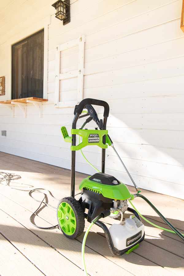 - Spray outdoor facade of home and patio with a pressure washer( I like the Greenworks Power Washer) to give everything a good cleaning