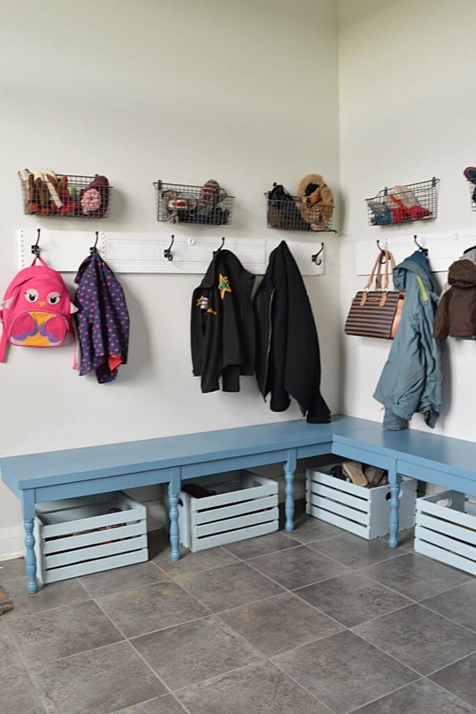 This mudroom design works well for our family and we all have plenty of space to store our gear. The wall hooks I installed are heavy duty and can hold my kids heavy backpacks without any problem.