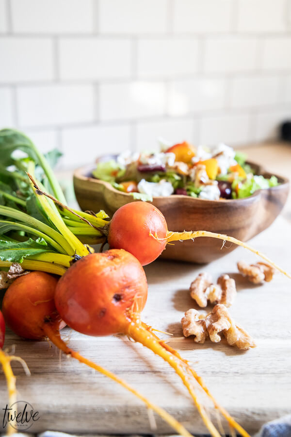 Its all because of these gorgeous golden beets. I love making this salad, and believe it or not, my kids LOVE this salad. I always make extra to have leftovers. I keep the goat cheese off until right before so they can make them a little bowl throughout the day. Some days its roasted beet and goat cheese salad, and sometimes its frozen pizza and corn dogs. Its all about balance, you know?