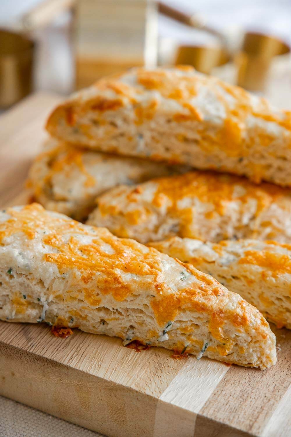 The texture of these flakey scones is so tender and the flavor with the chives and sharp. cheddar cheese is spot on. These tender scones will be a sure fire hit in your house. I. love. that you do not need a food processor. or pastry blender to make these scones. I love simple recipes that require just my hands.