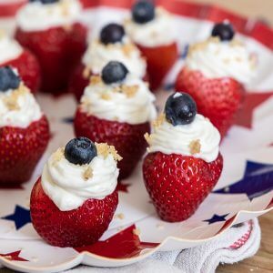- Pipe this mixture into the strawberry tops. Top with graham cracker crumbs, and a blueberry to add the red white and blue!
